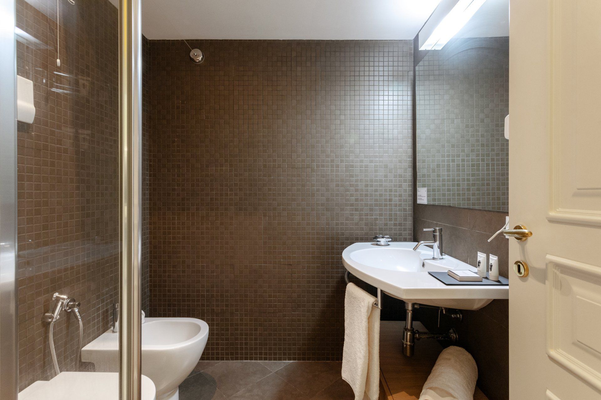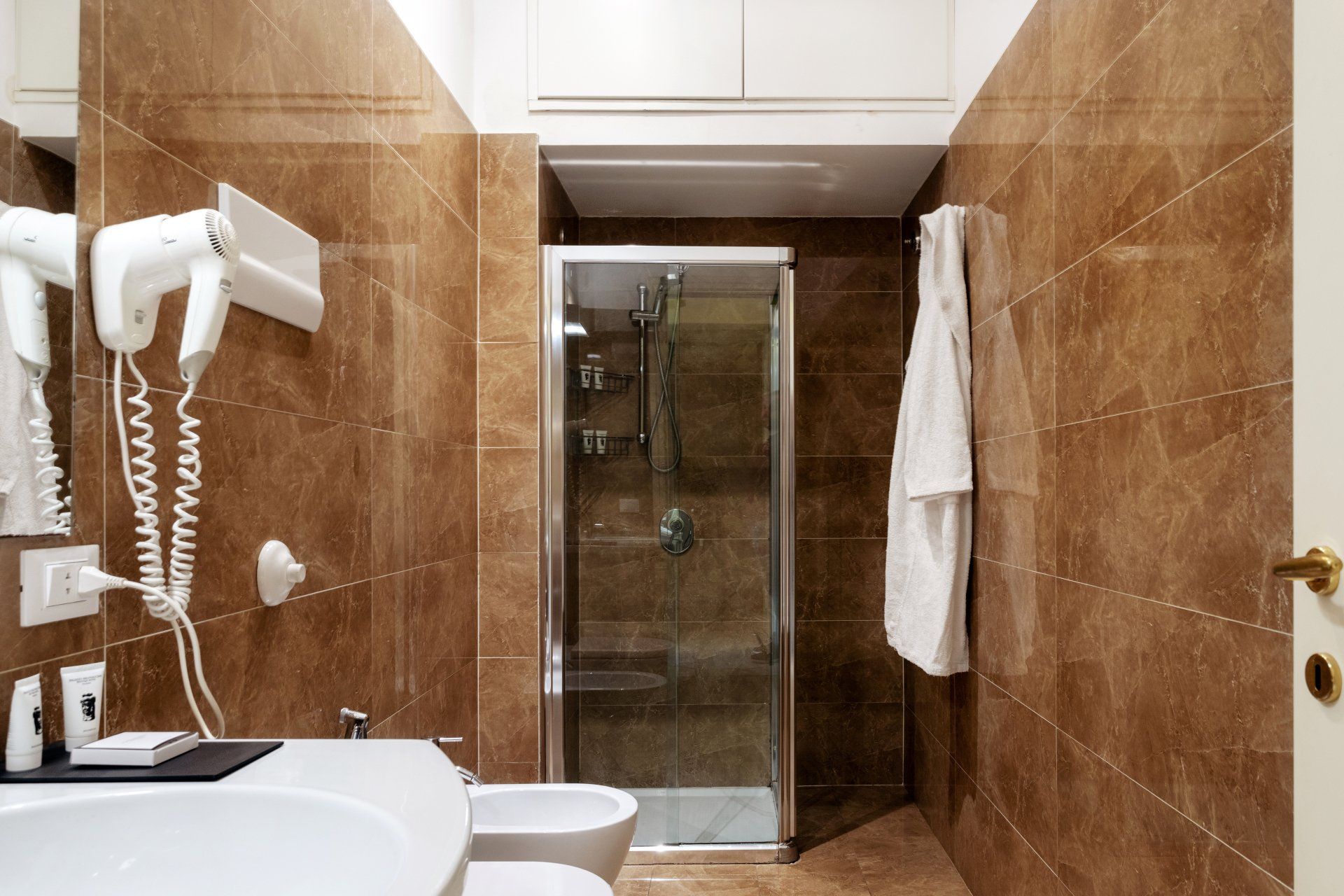 Il bagno in camera dispone di doccia, asciugacapelli, biancheria di alta qualità e set di cortesia.