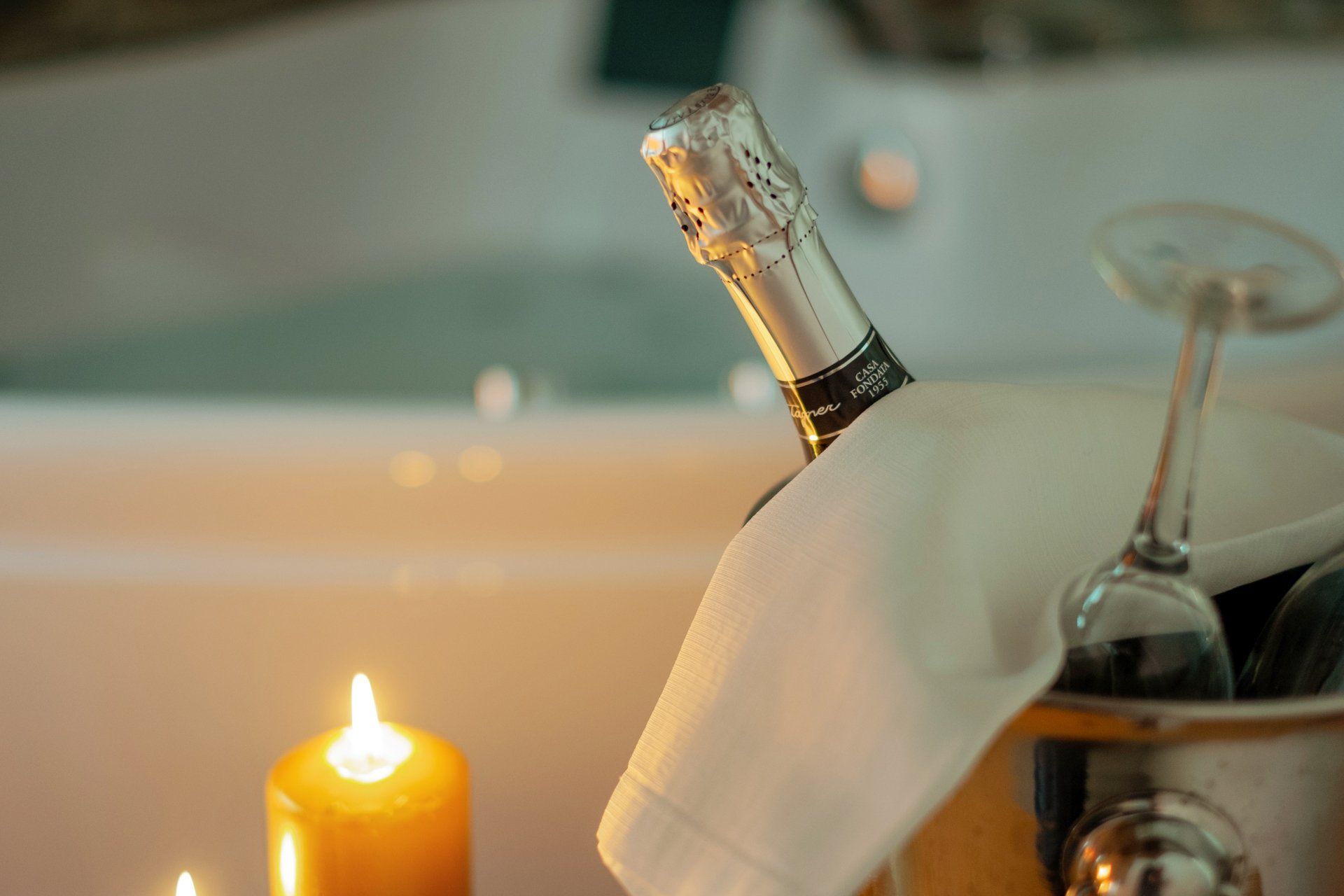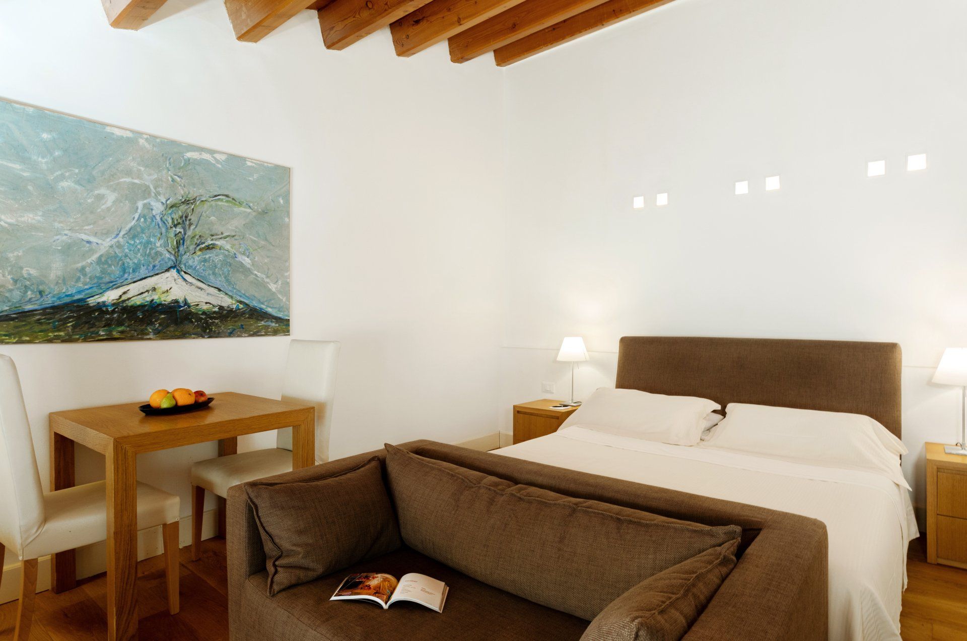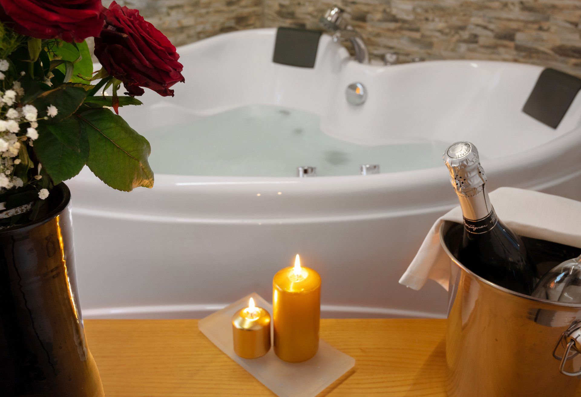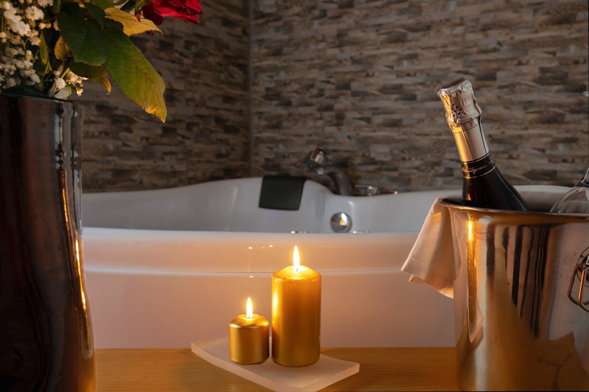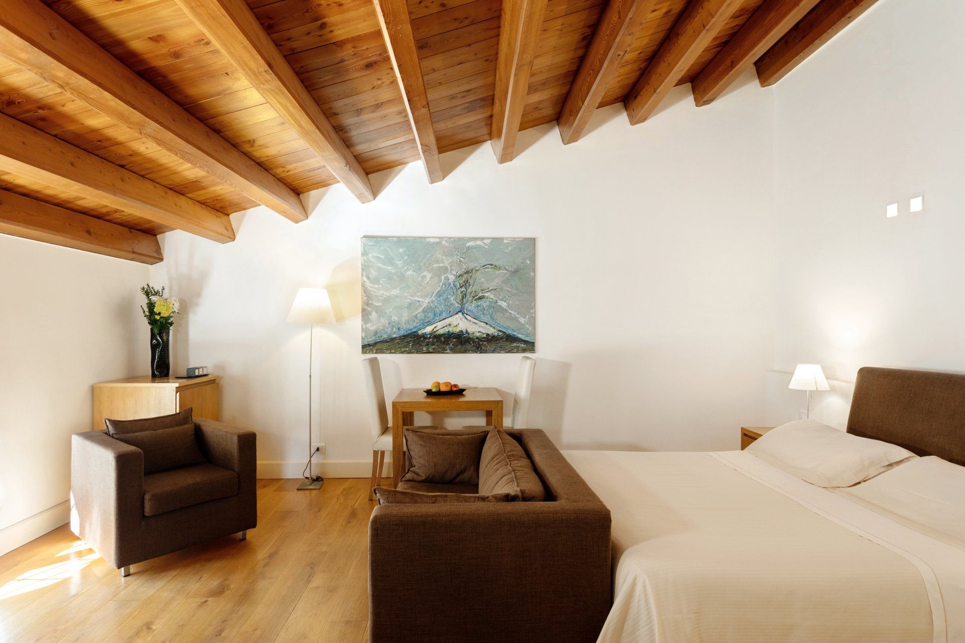 Romantiche camere dotate di area relax con vasca idromassaggio biposto, zona soggiorno arricchita da tele d’autore, pavimento in parquet e tetto con travi in legno a vista.