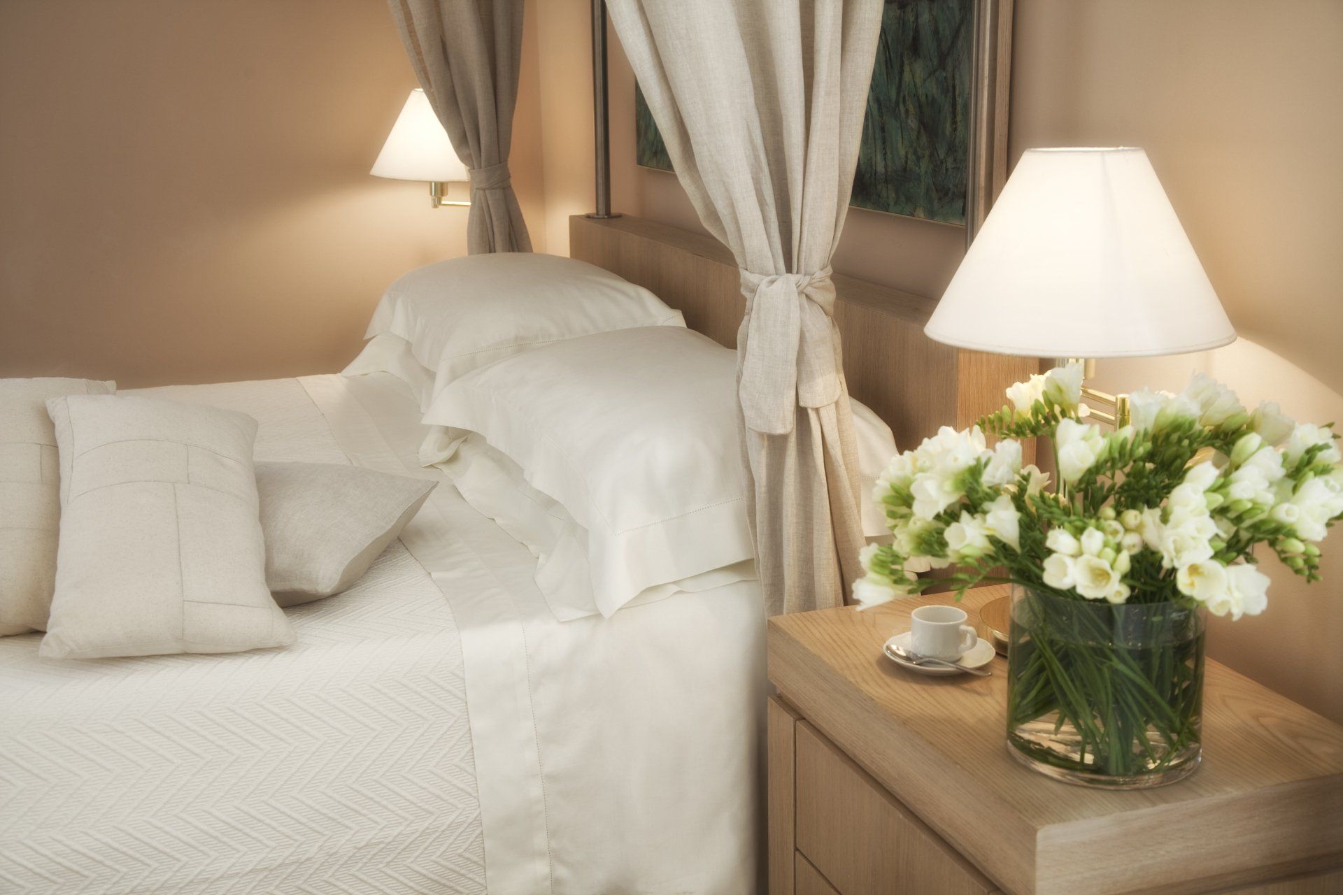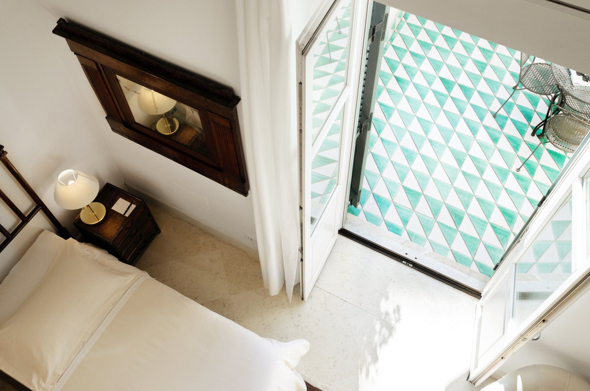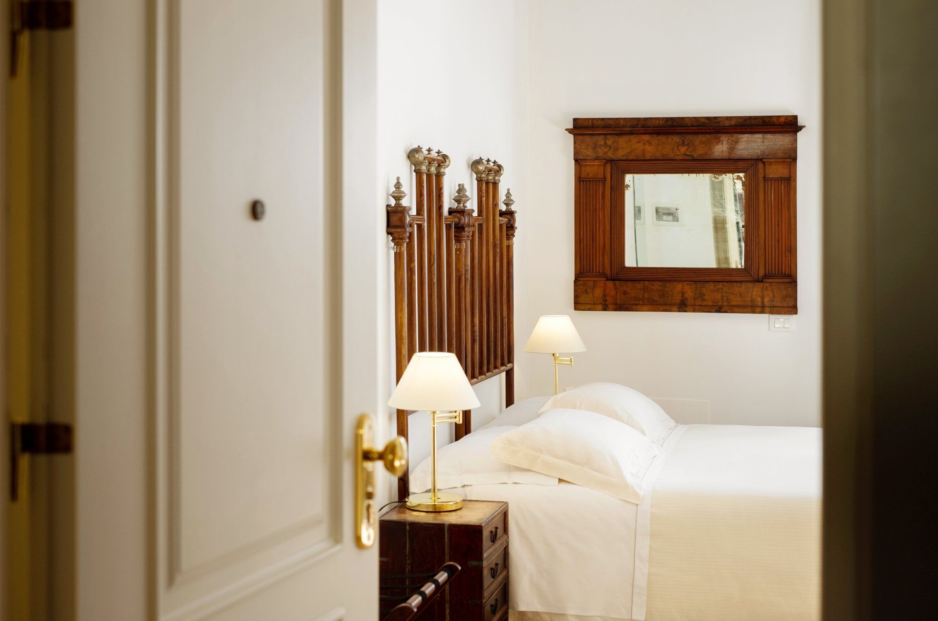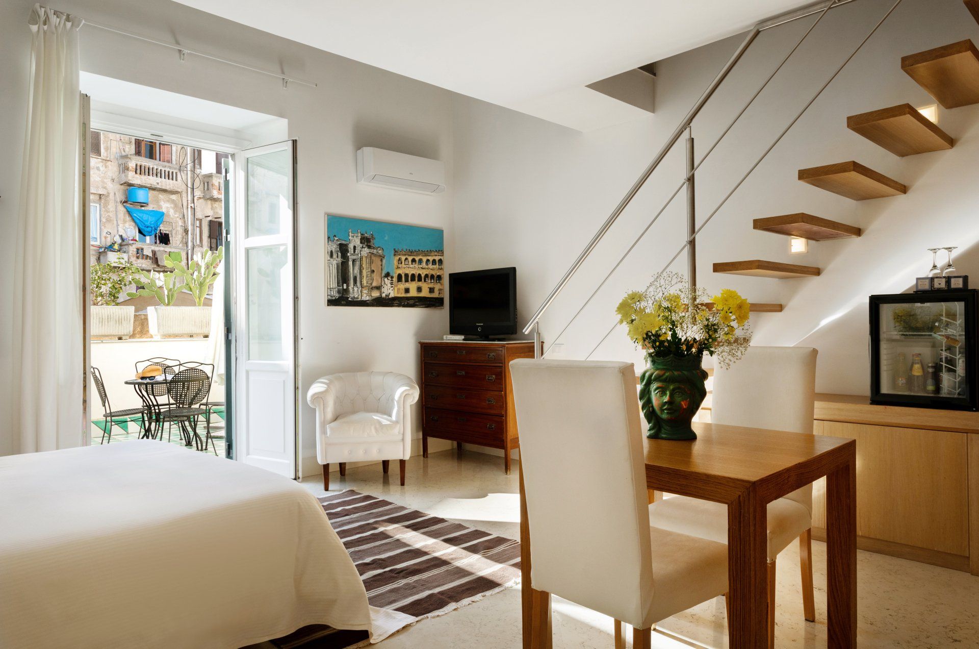 Eleganti camere ampie e luminose, arricchite da arredi di pregio, tele d’autore e ceramiche siciliane, dotate di area soggiorno e tavolo da pranzo.